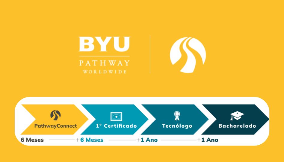 A BYU-Pathway Worldwide segue essa estrutura em que as pessoas vão progredindo em sua jornada acadêmica: pathway connect, certificados, tecnólogo, e por fim o bacharelado.